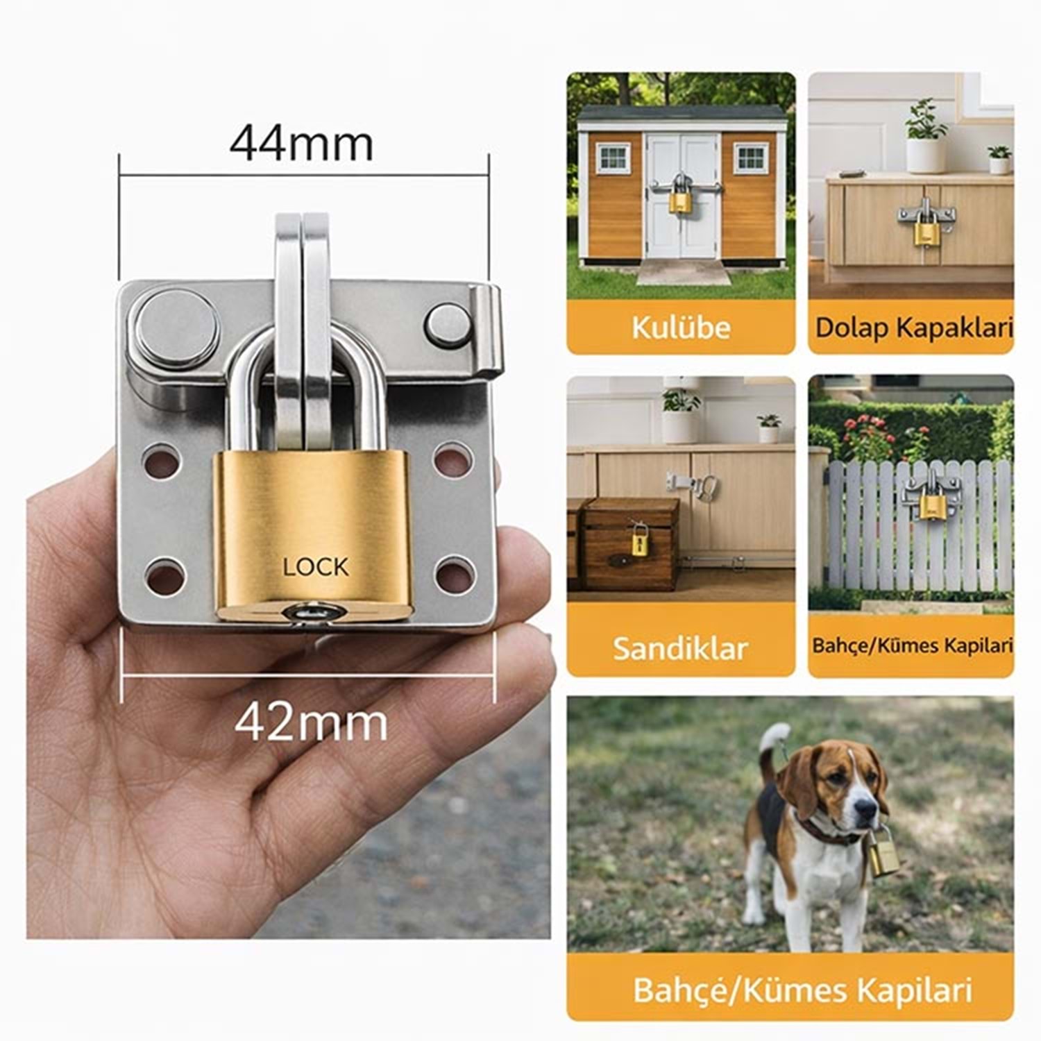 Bahçe kapıları, dolap kapakları, sandıklar, çit kapıları, kümes kapakları, ahşap ve metal kapak sistemlerinde güvenli kapama aparatı olarak kullanılabilir. Hem iç hem dış mekan uygulamalarına uygundur.
